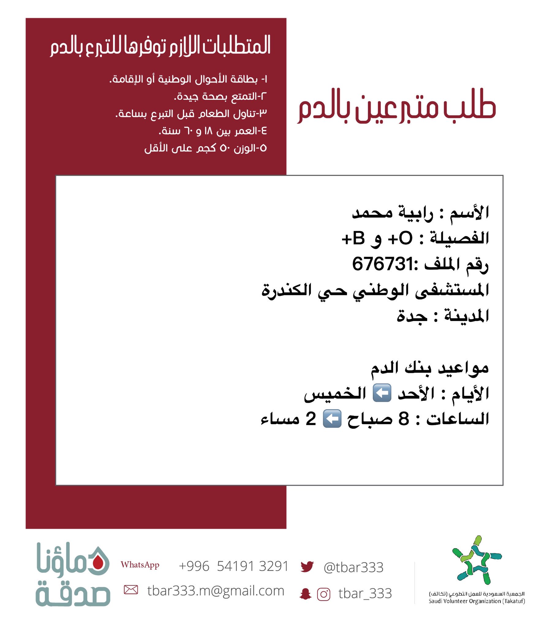 دمـ ـا ؤ نـ ـا صـ ـد قـ ـة On Twitter عاجل الأسم رابية محمد الفصيلة O و B رقم الملف 676731 المستشفى الوطني بحي الكندرة جدة دم