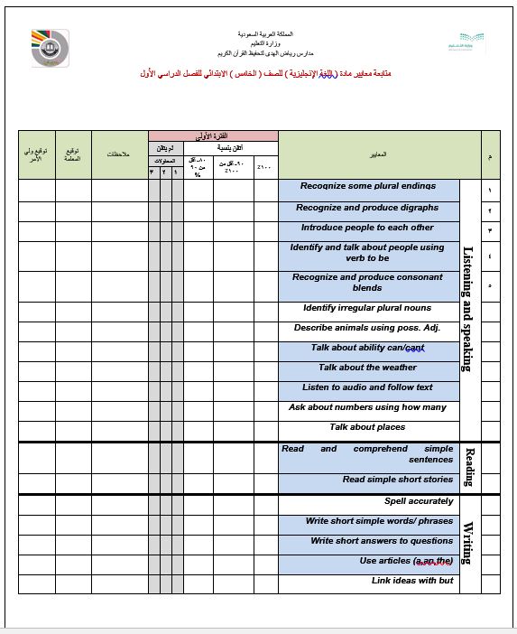 سجل متابعة المعايير للصف الأول الابتدائي الفصل الدراسي الثاني 1440