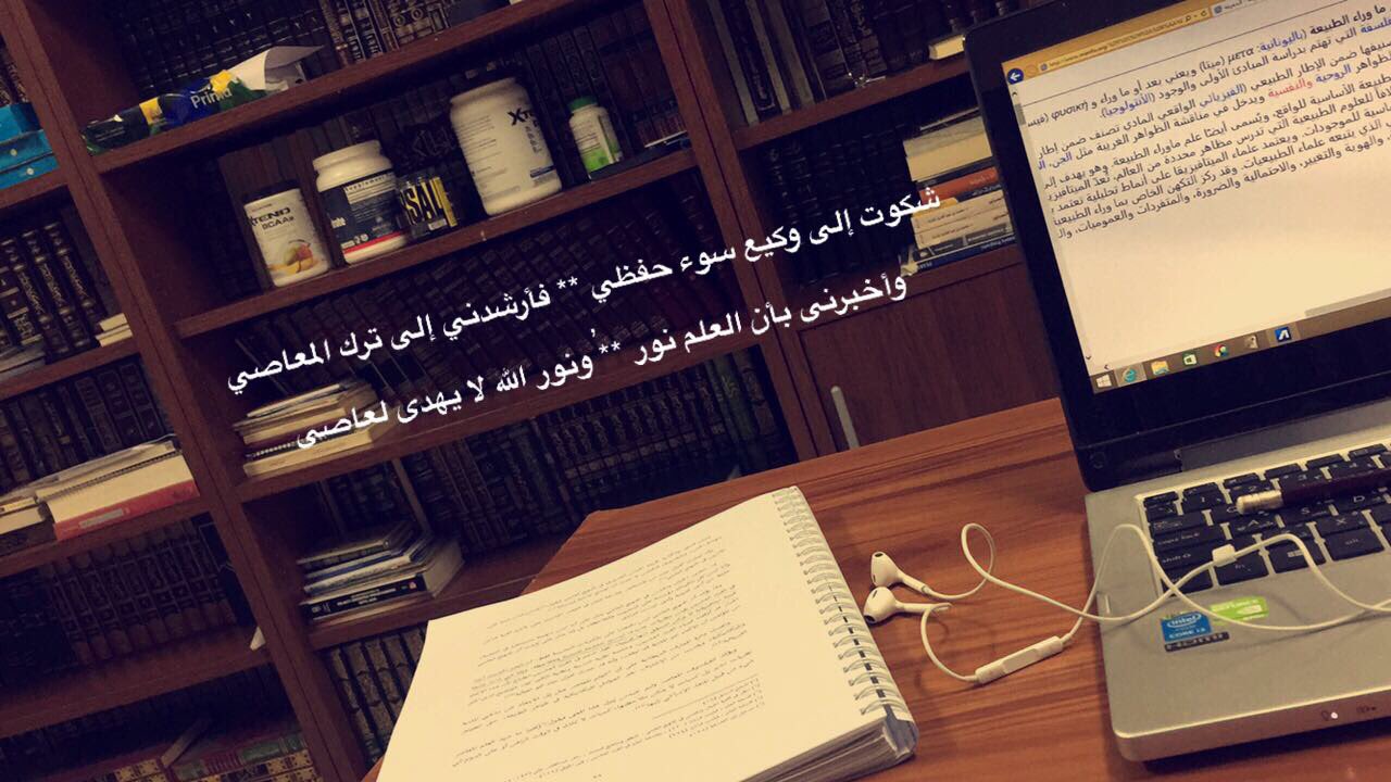 لغة القرآن شكوت إلى وكيع سوء حفظي قال الامام الشافعي ش ك و ت إل ى و ك يع س وء ح ف ظ ي ف أر ش د ن ي إل ى ت ر ك المع اصي و أخ ب ر ن ي بأ ن الع ل م ن ور ونور الله لا يهدى لعاصي كان