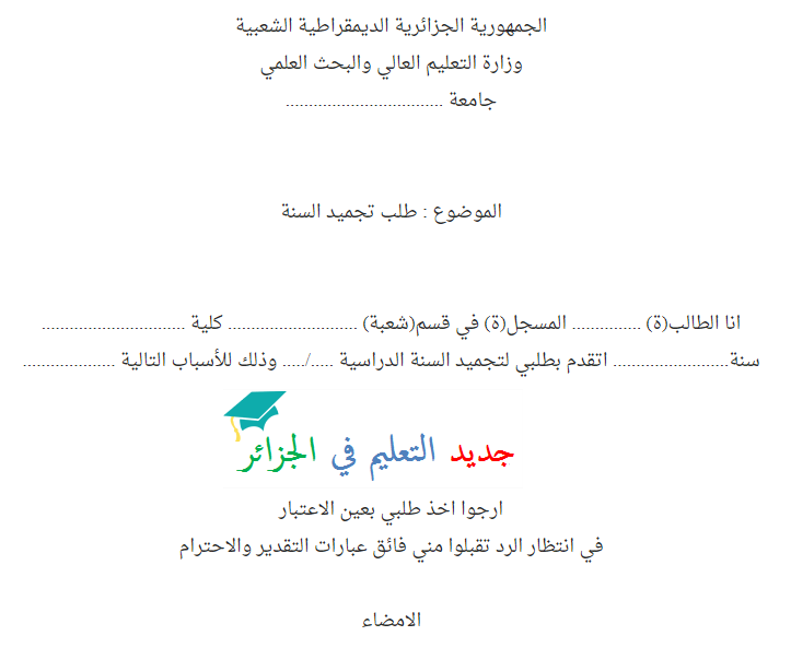 نموذج لطلب خطي لتجميد السنة الدراسية الجامعية