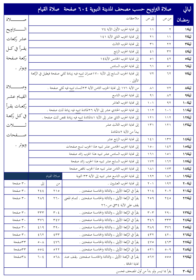 محتسب تقسيم المصحف على ليالي رمضان في التراويح والقيام حسب مصحف المدينة النبوية 604 صفحة