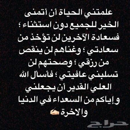 علمتني الحياة أن أتمنى الخير للجميع دون إستثناء فسعادة الآخرين لن ت ؤخذ من سعادتي وغ ناهم لن ي نقص من رزقي وصحتهم لن تسلبني عافيتي اسأل الله أن يجعلني وإياكم من السعداء