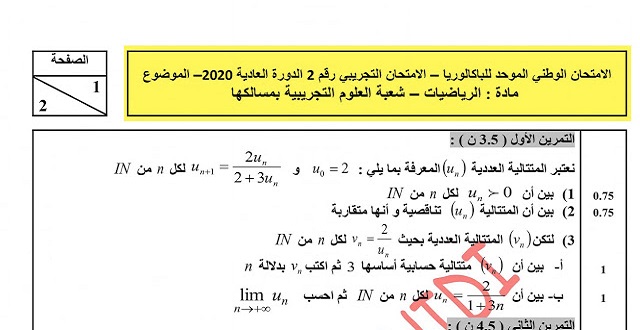 الامتحان الوطني للبكالوريا في الرياضيات 2020 علوم تجريبية مرفق مع التصحيح الدورة العادية